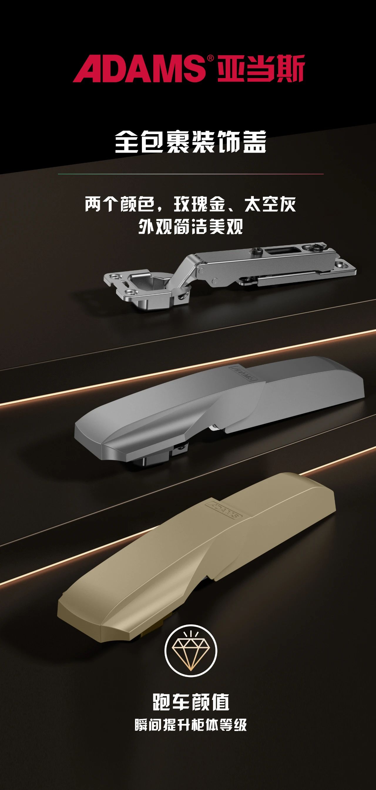 每款跑車鉸鏈都搭配全包裹裝飾蓋,裝飾蓋板隨著鉸鏈的運行而同步滑動,并將鉸鏈主體機構隱藏于其中。跑車鉸鏈顏色分為:玫瑰金和太空灰,讓鉸鏈融入到家居設計中,為您的櫥柜一角增添質感,滿足個性化的追求與需求。