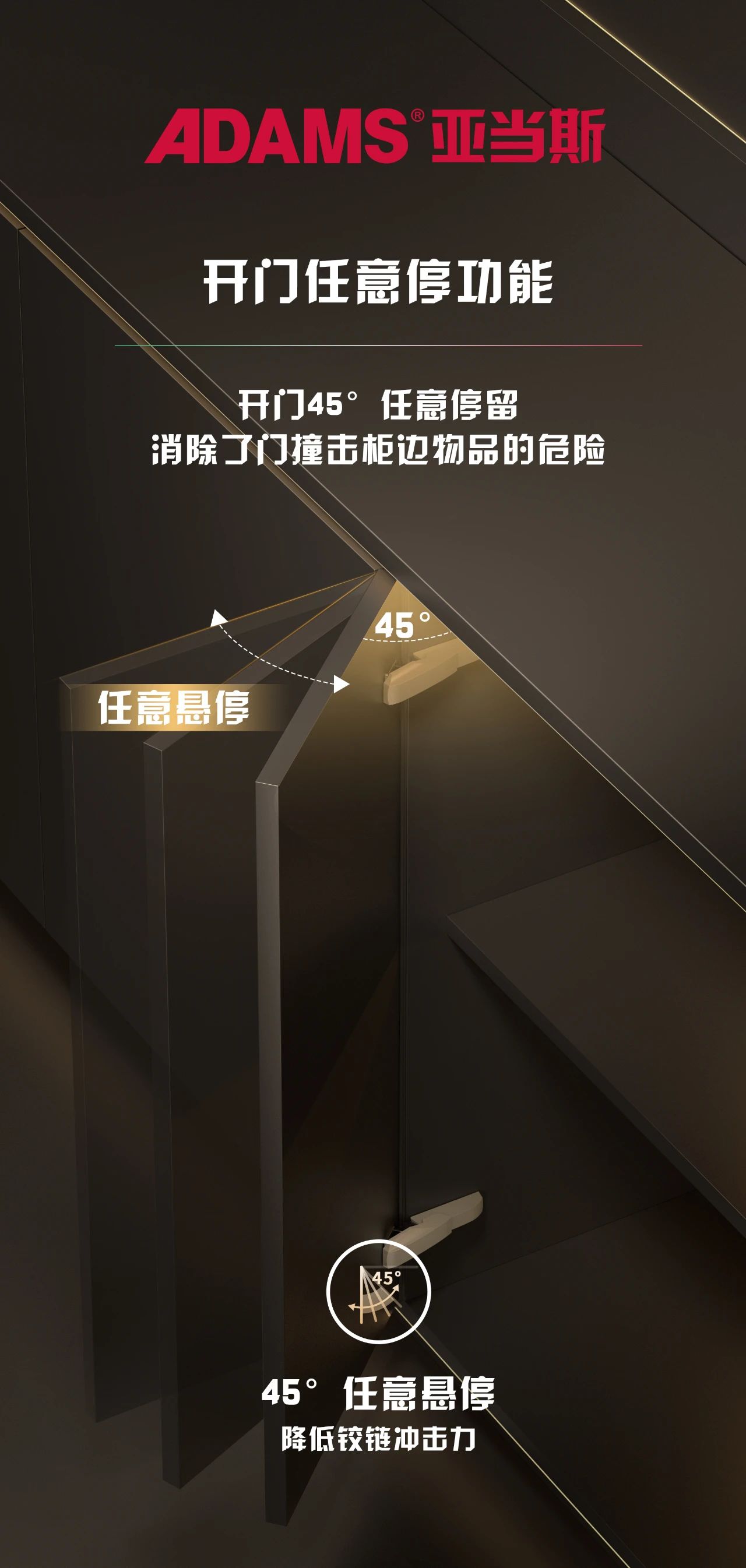 跑車鉸鏈含有兩段力功能,可實現(xiàn)打開角度大于45°后,柜門能在45°~105°之間任意位置停下,消除以往緩沖鉸鏈開門即到最大開門角度的缺陷,消除門撞擊柜邊物品的危險。