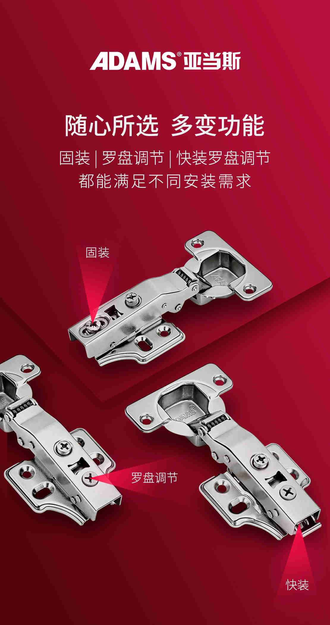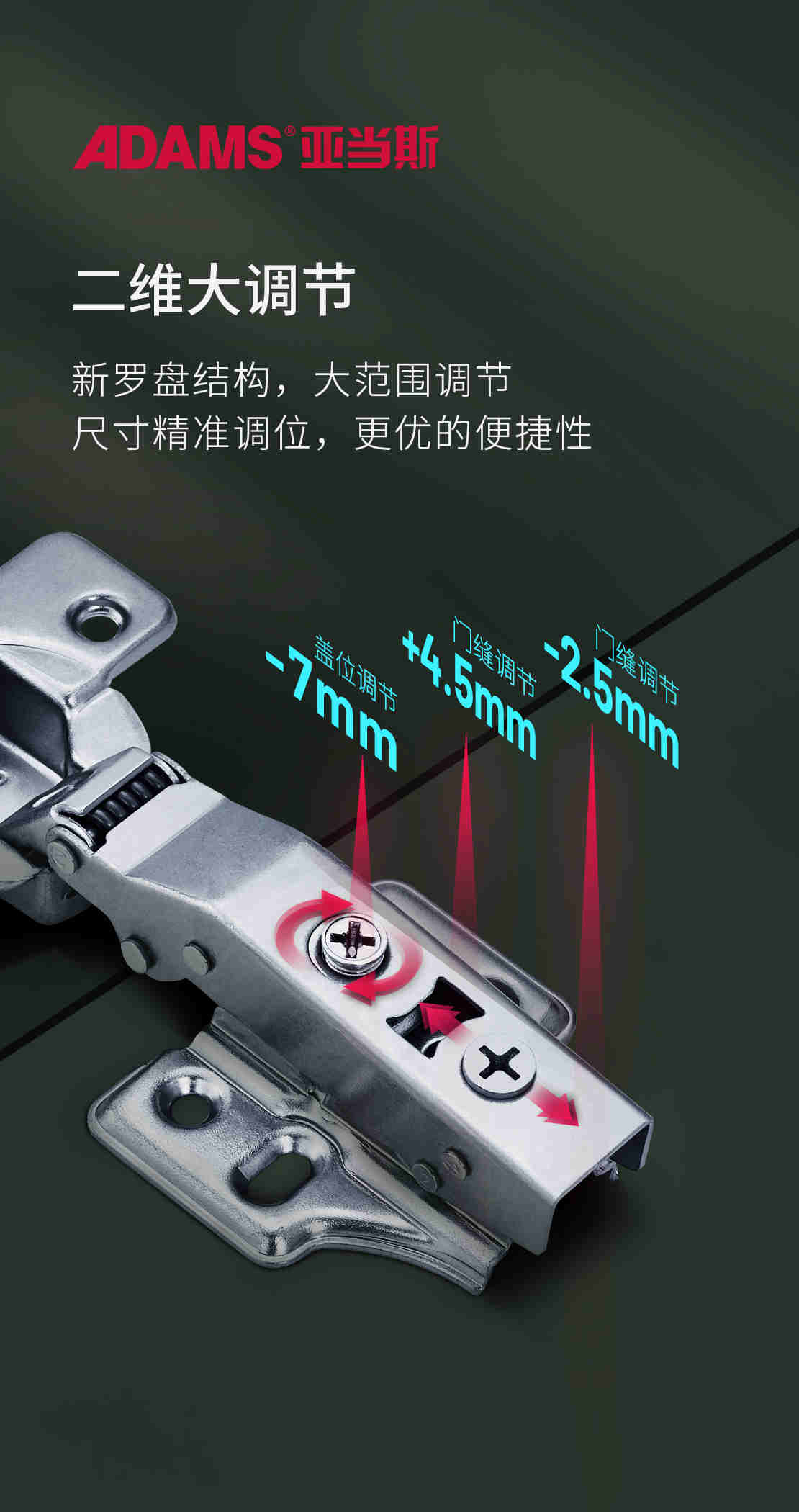 亞當(dāng)斯變幻王再次突破界限,在安裝時(shí)間上更快,直接轉(zhuǎn)動(dòng)尾部的調(diào)節(jié)羅盤(pán)即可實(shí)現(xiàn)門(mén)的前后調(diào)節(jié),省時(shí)省力,比傳統(tǒng)安裝速度快五倍以上,調(diào)節(jié)能力大大提升。相較于市面上二維調(diào)節(jié)鉸鏈的前后合計(jì)調(diào)節(jié)4mm,變幻王前可調(diào)節(jié)4.5mm、 后可調(diào)節(jié)2.5mm,前后合計(jì)調(diào)節(jié)量達(dá)7mm;底座安裝距離超越國(guó)際標(biāo)準(zhǔn)37mm,可調(diào)空間更大,不受限制、高效便捷。