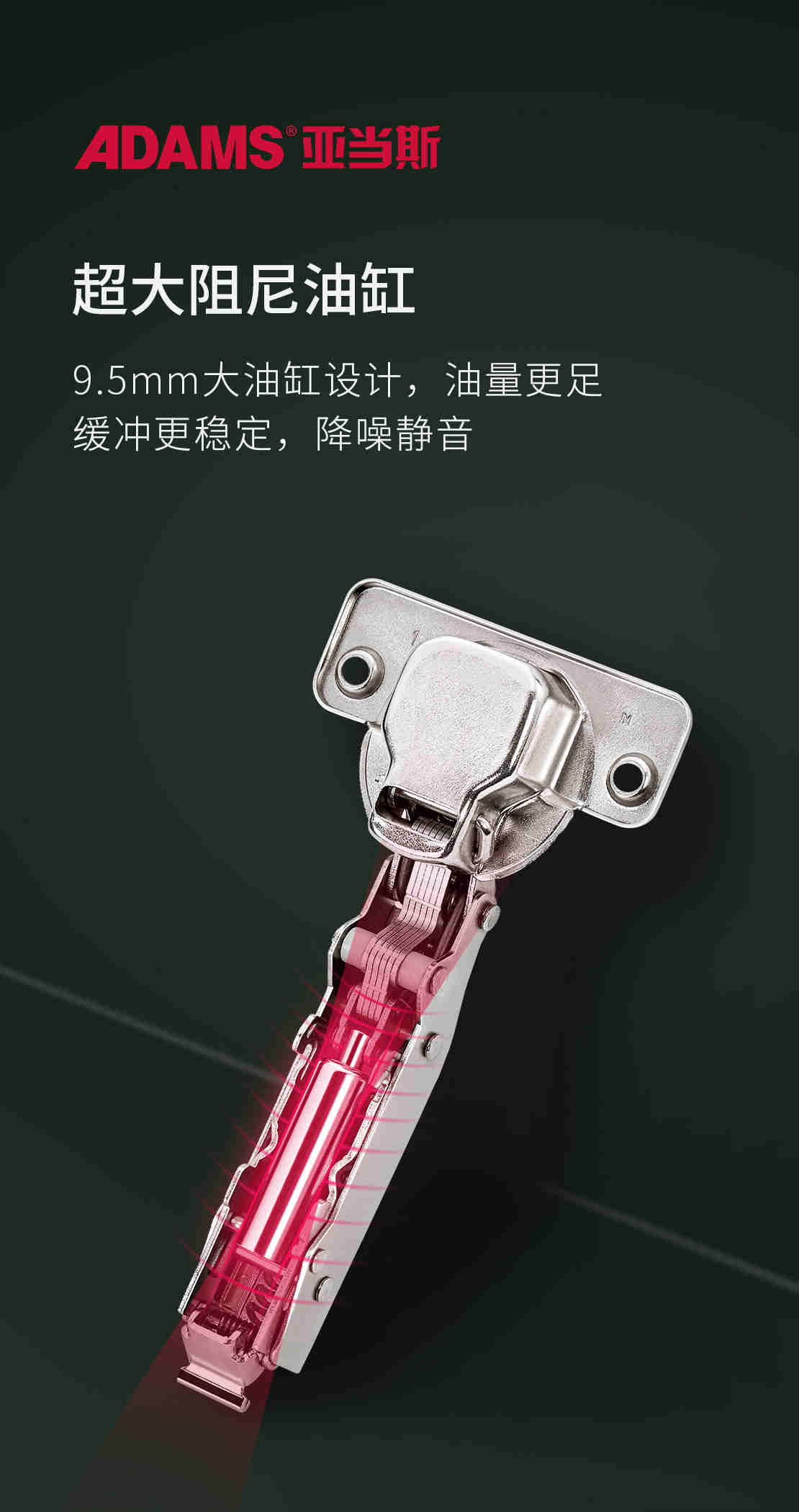 亞當(dāng)斯變幻王采用9.5mm大油缸,容量大在活動(dòng)過(guò)程中更穩(wěn)定,防止瞬間閉合夾到手,開(kāi)合之間跟噪音說(shuō)再見(jiàn)。