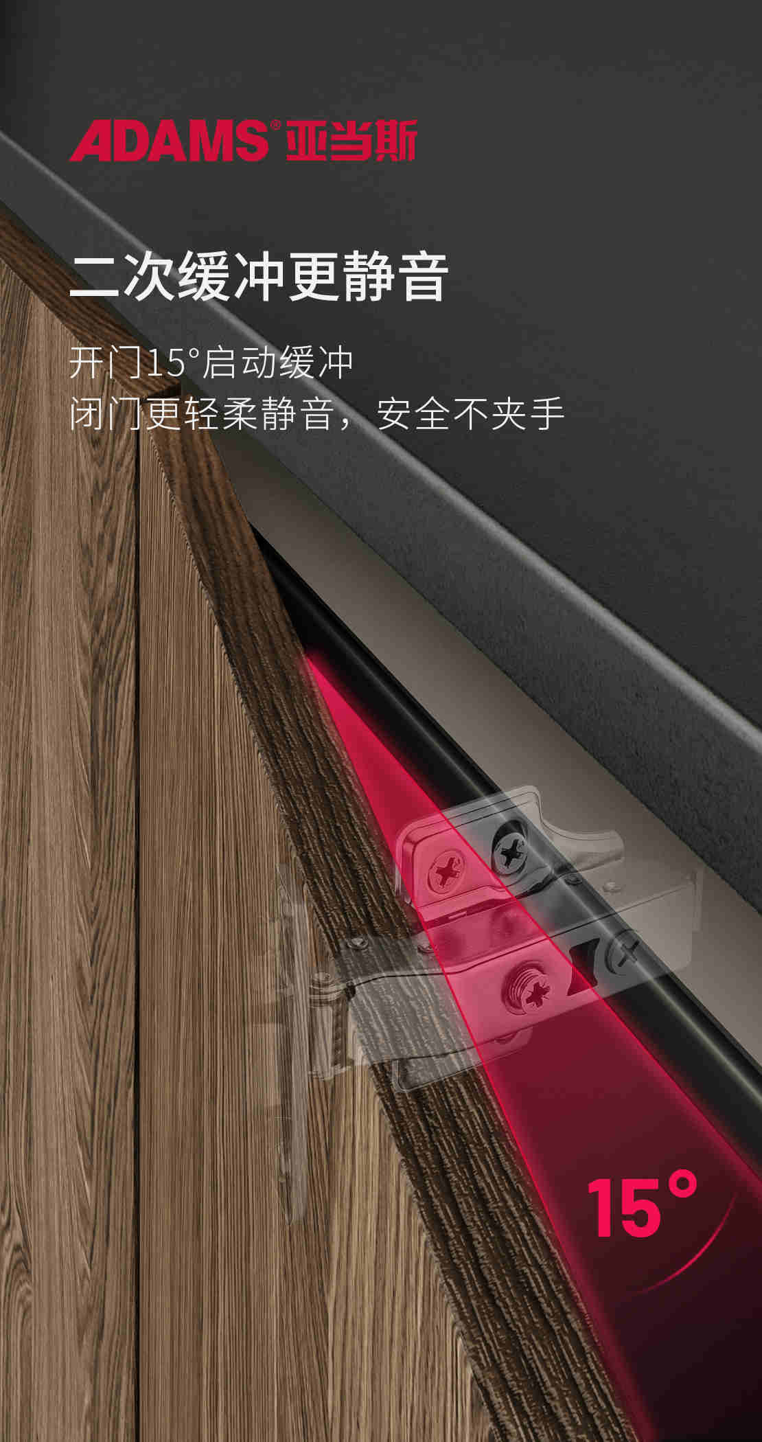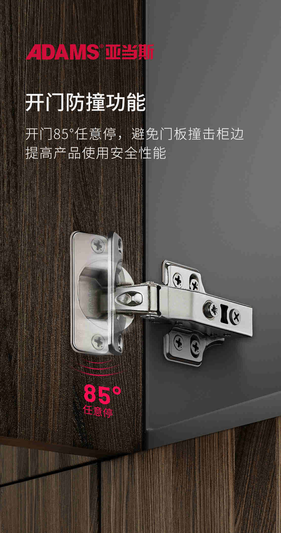 亞當(dāng)斯變幻王在設(shè)計(jì)上更具人性化,開(kāi)門(mén)85°隨意停下,15°小角度緩沖效果能有效防止“被門(mén)板夾手”的情況,同時(shí)能更好地保護(hù)門(mén)板。