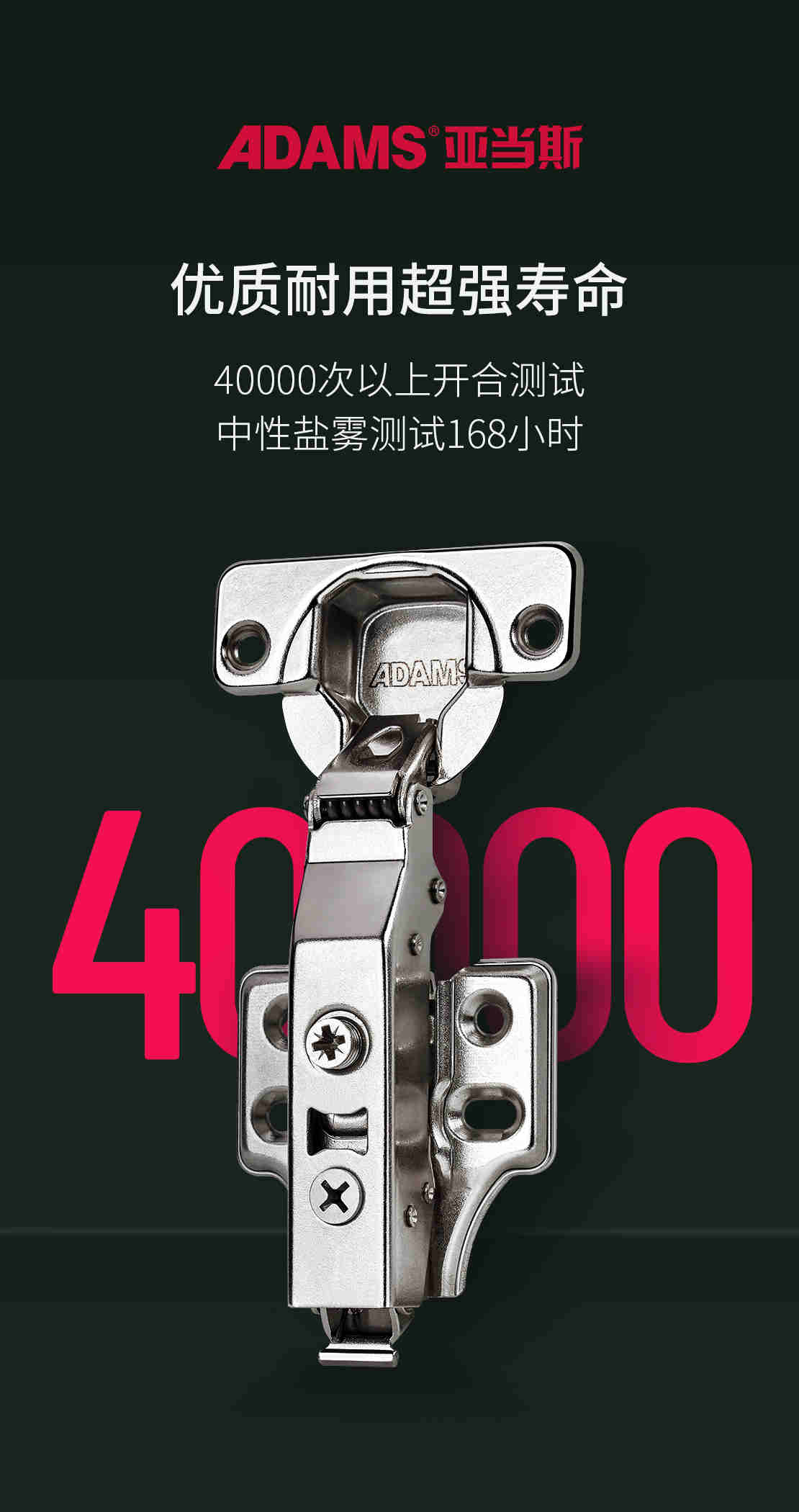 亞當(dāng)斯變幻王各組成零件之間切合緊密,不易產(chǎn)生松動(dòng),鉸鏈表面經(jīng)過(guò)中性鹽霧測(cè)試168小時(shí),酸性測(cè)試24小時(shí),開(kāi)合壽命40000次,一開(kāi)一關(guān)之間手感更輕巧。