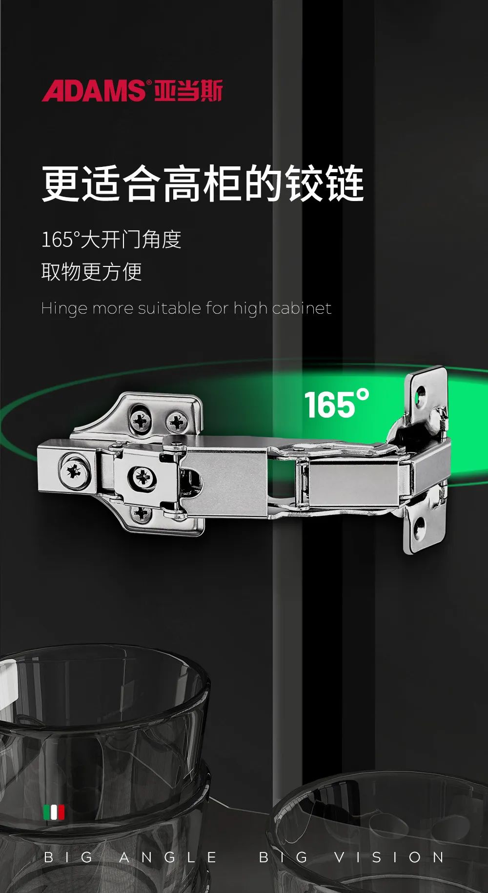 鉸鏈165°大開(kāi)門(mén)角度,安裝在櫥柜門(mén)上能擴(kuò)大柜內(nèi)空間和視野,即便是在轉(zhuǎn)角處的柜門(mén),也能有效解決常規(guī)鉸鏈開(kāi)啟角度不夠的難題,方便取物。