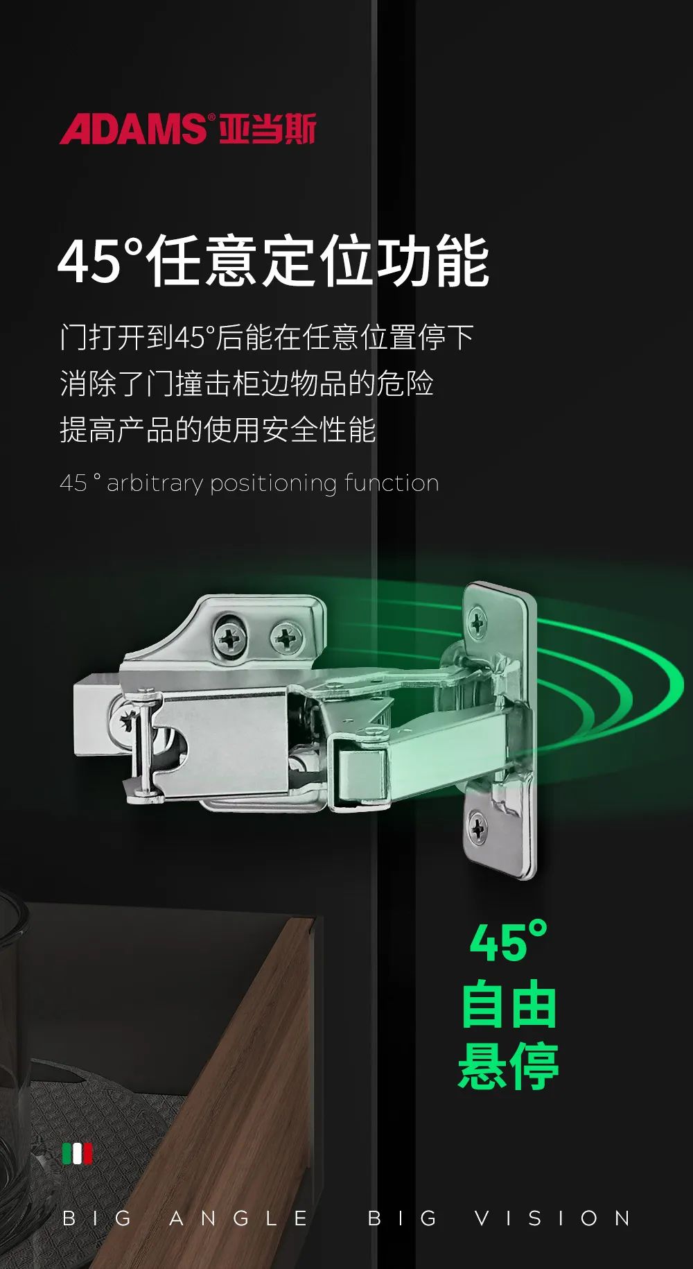 45°后自由懸停更安全,該鉸鏈為二段力任意停鉸鏈,在開(kāi)啟角度大于45°后能隨意定位,成功避免門(mén)板或墻壁之間的碰撞和消除柜門(mén)撞擊柜邊物品的危險(xiǎn)。