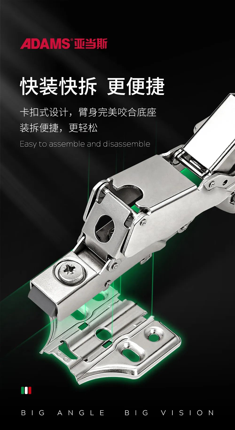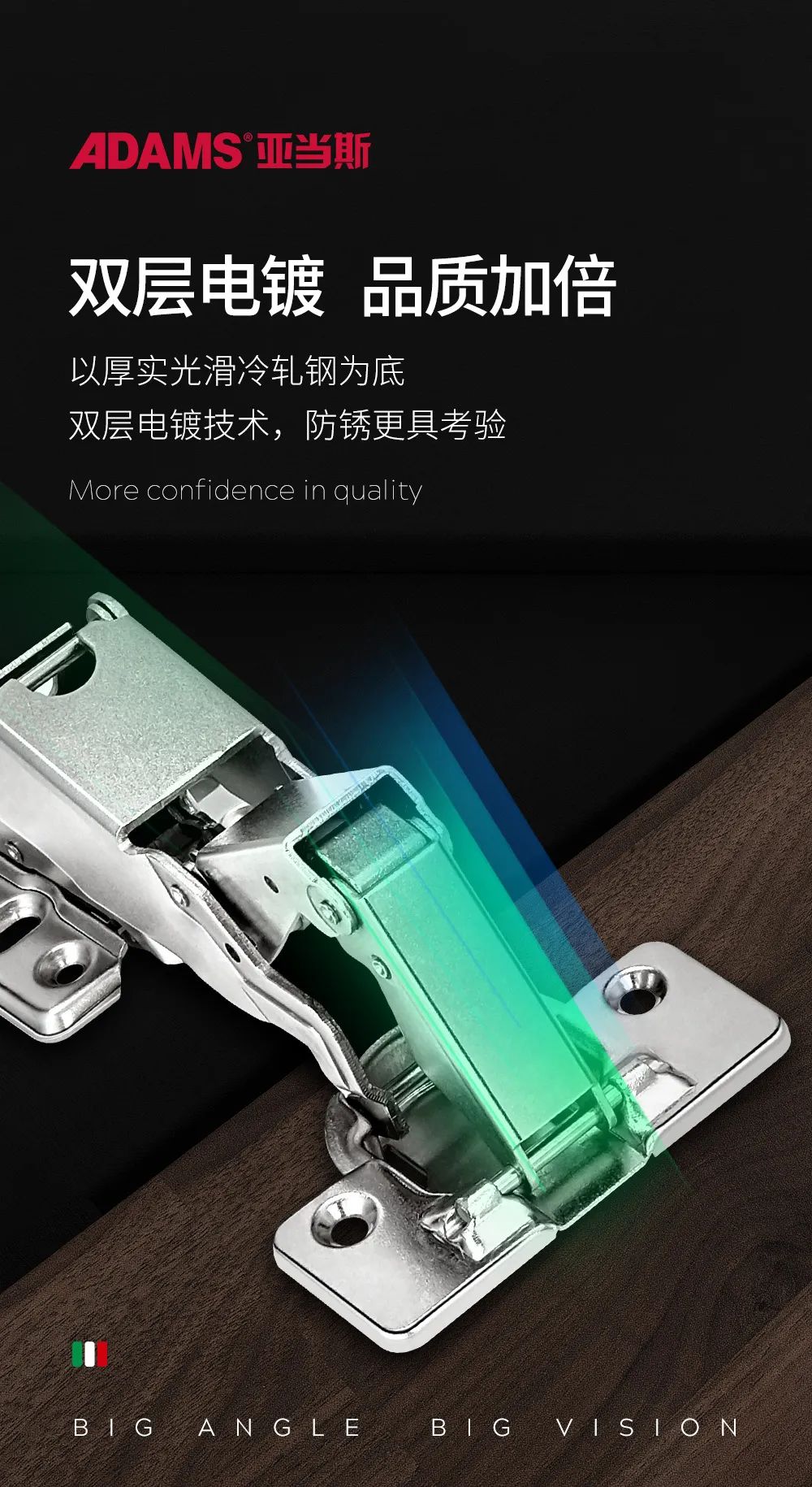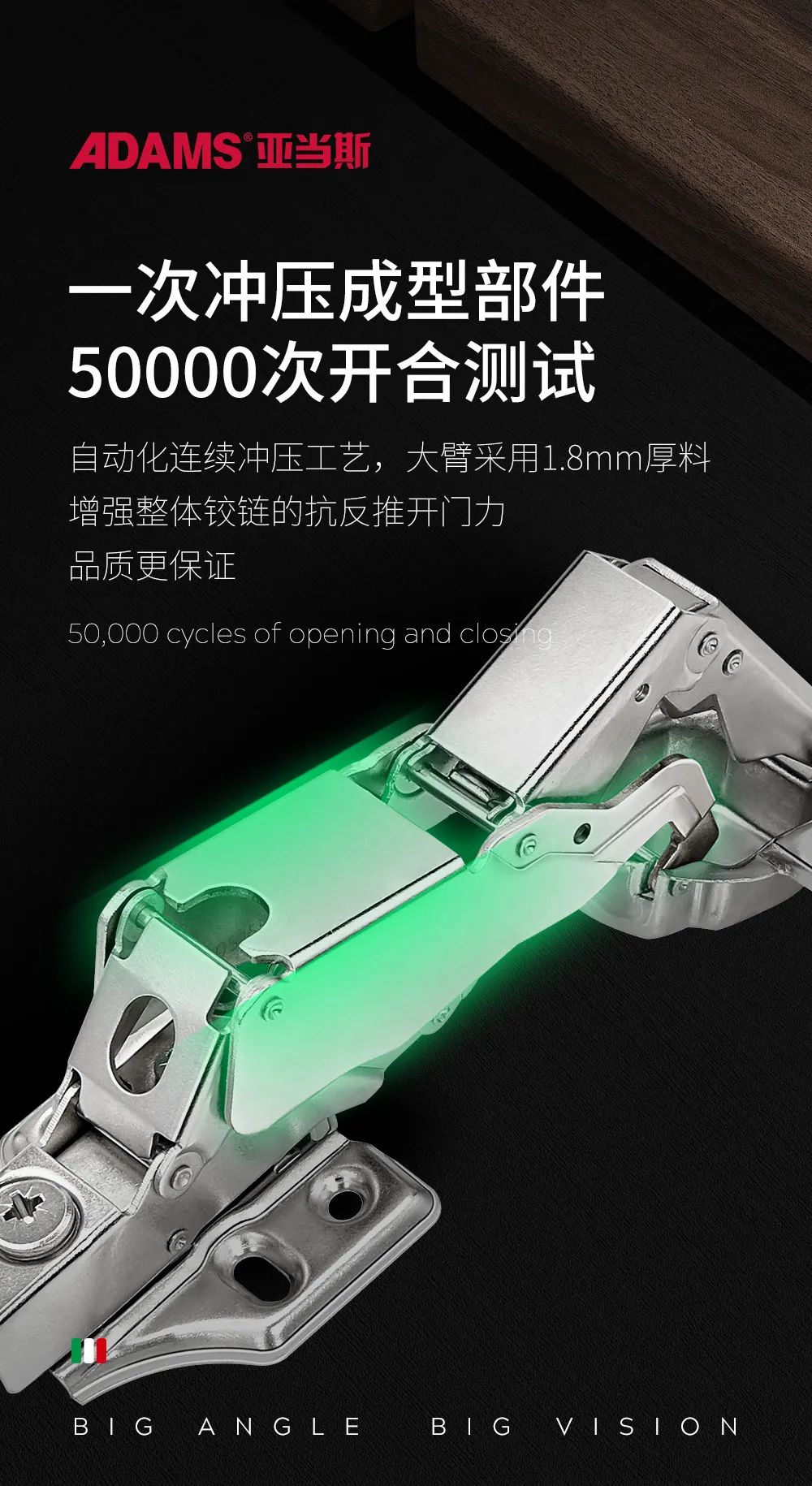 ADS165°大角度鉸鏈采用自動(dòng)化連續(xù)沖壓工藝,鉸鏈部件一次沖壓成型,柜門(mén)開(kāi)合次數(shù)達(dá)到5萬(wàn)次,加厚大臂使用1.8mm材料,增強(qiáng)整體鉸鏈的抗反推開(kāi)門(mén)力,外表潤(rùn)滑、手感扎實(shí)。