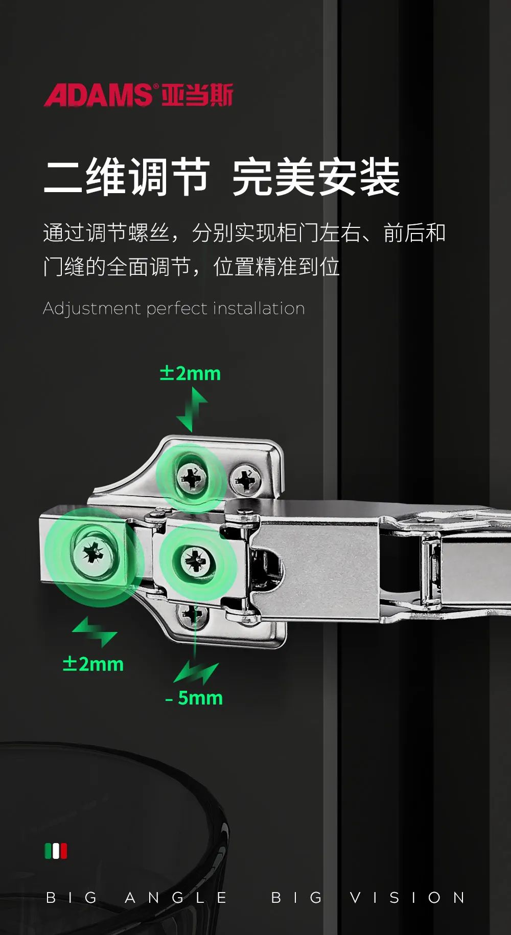 極具人性化的二維調(diào)節(jié),左右調(diào)節(jié)-5mm~±2mm,前后調(diào)節(jié)±2mm,保證了鉸鏈關(guān)節(jié)靈活性,讓柜門(mén)更嚴(yán)密、穩(wěn)定性高。
