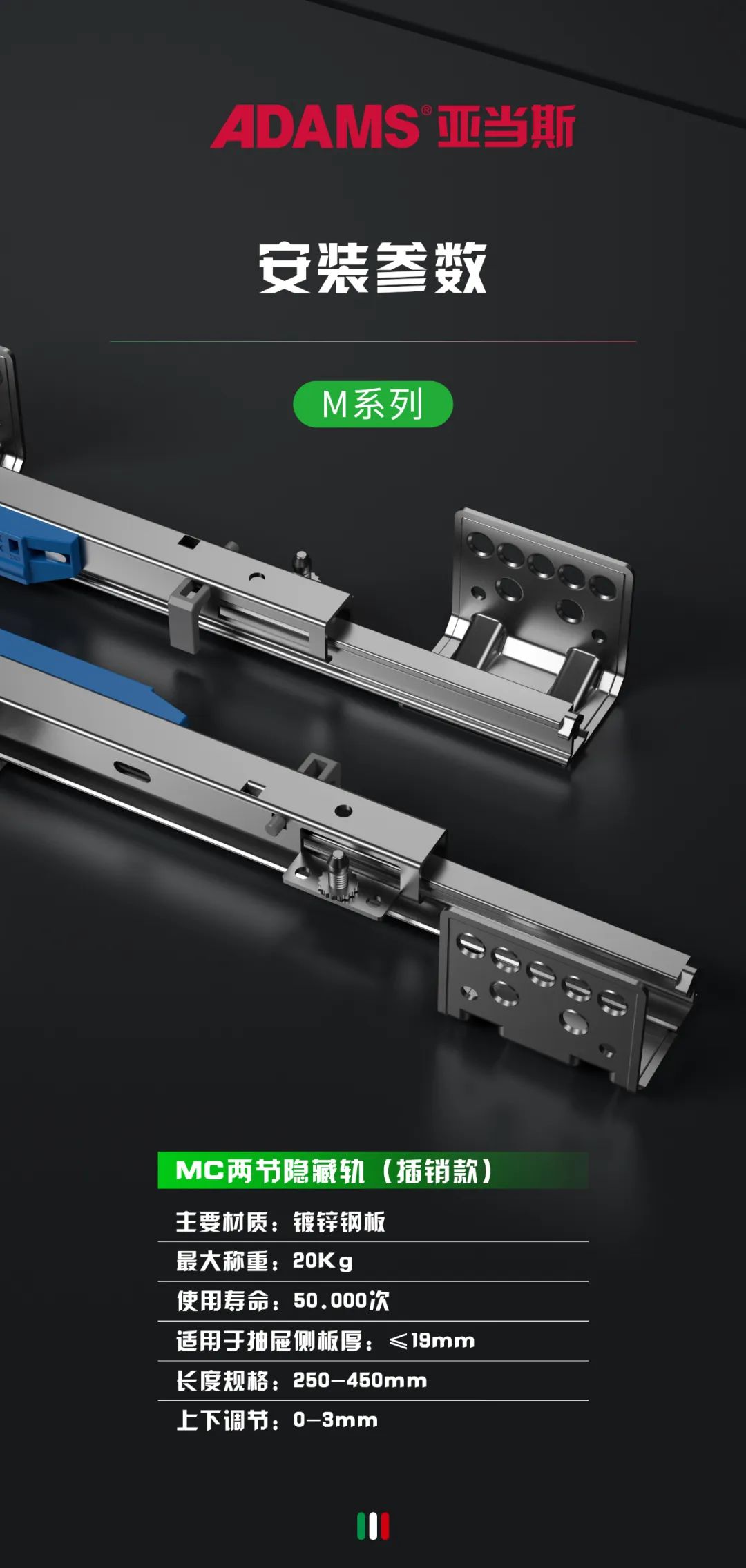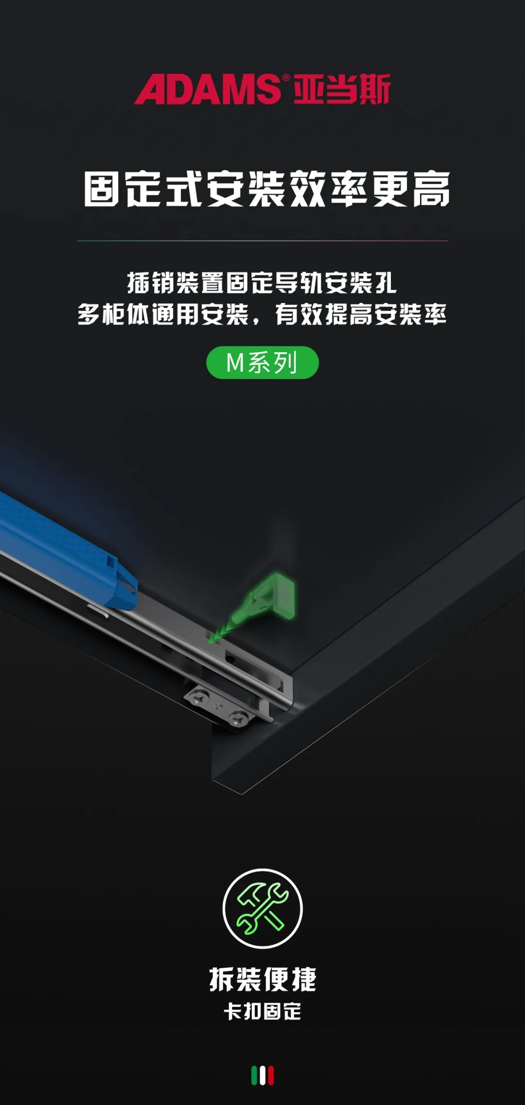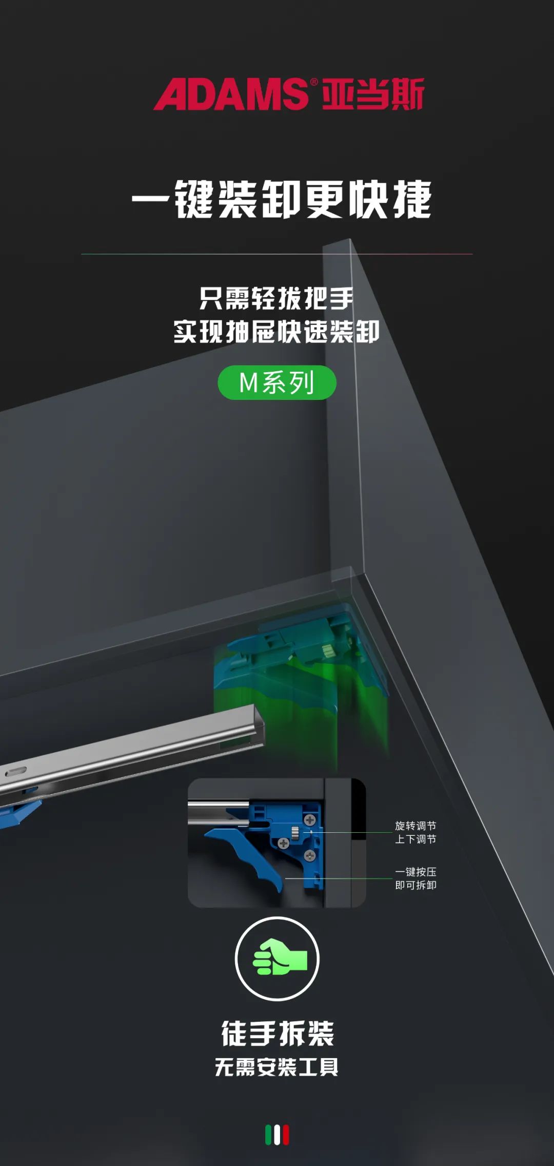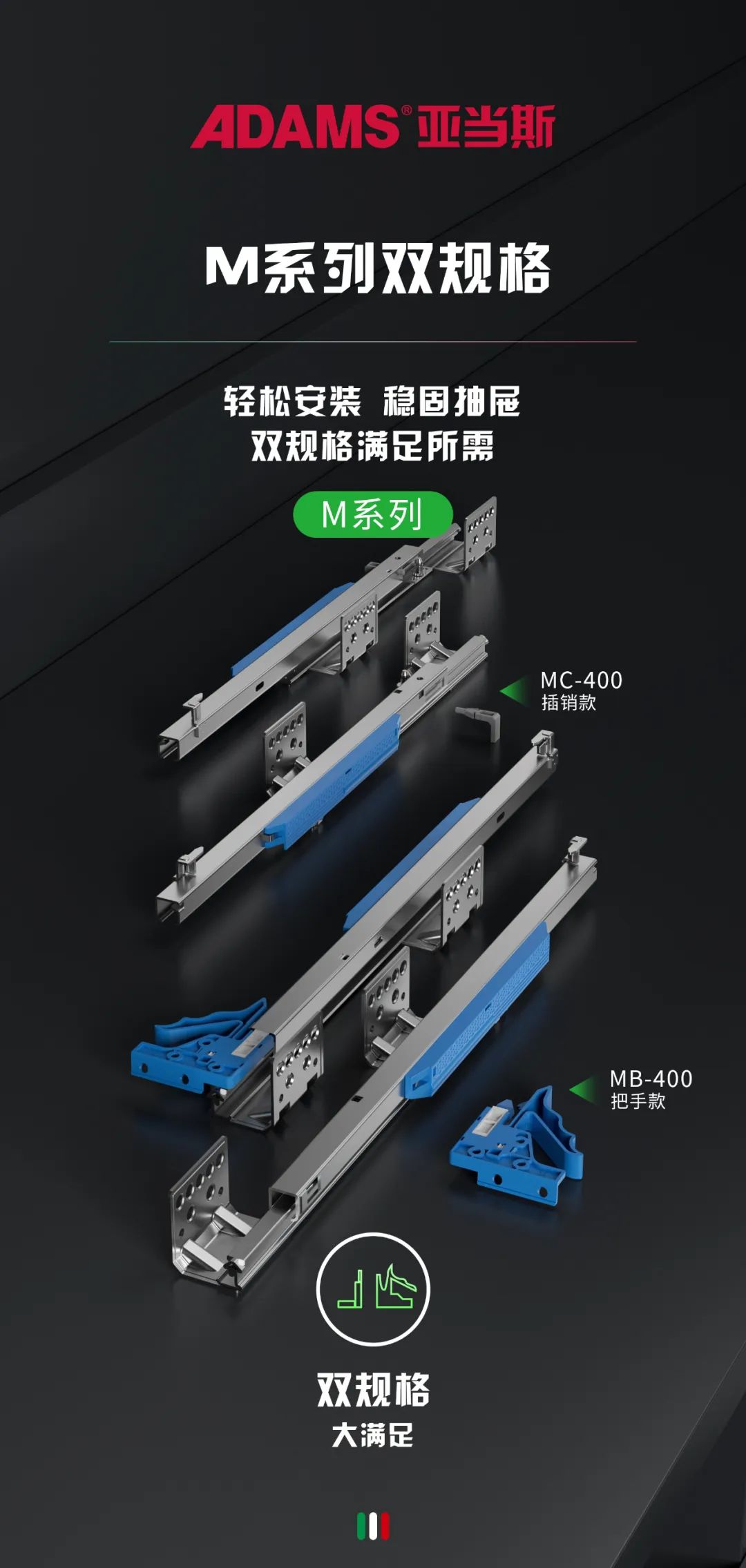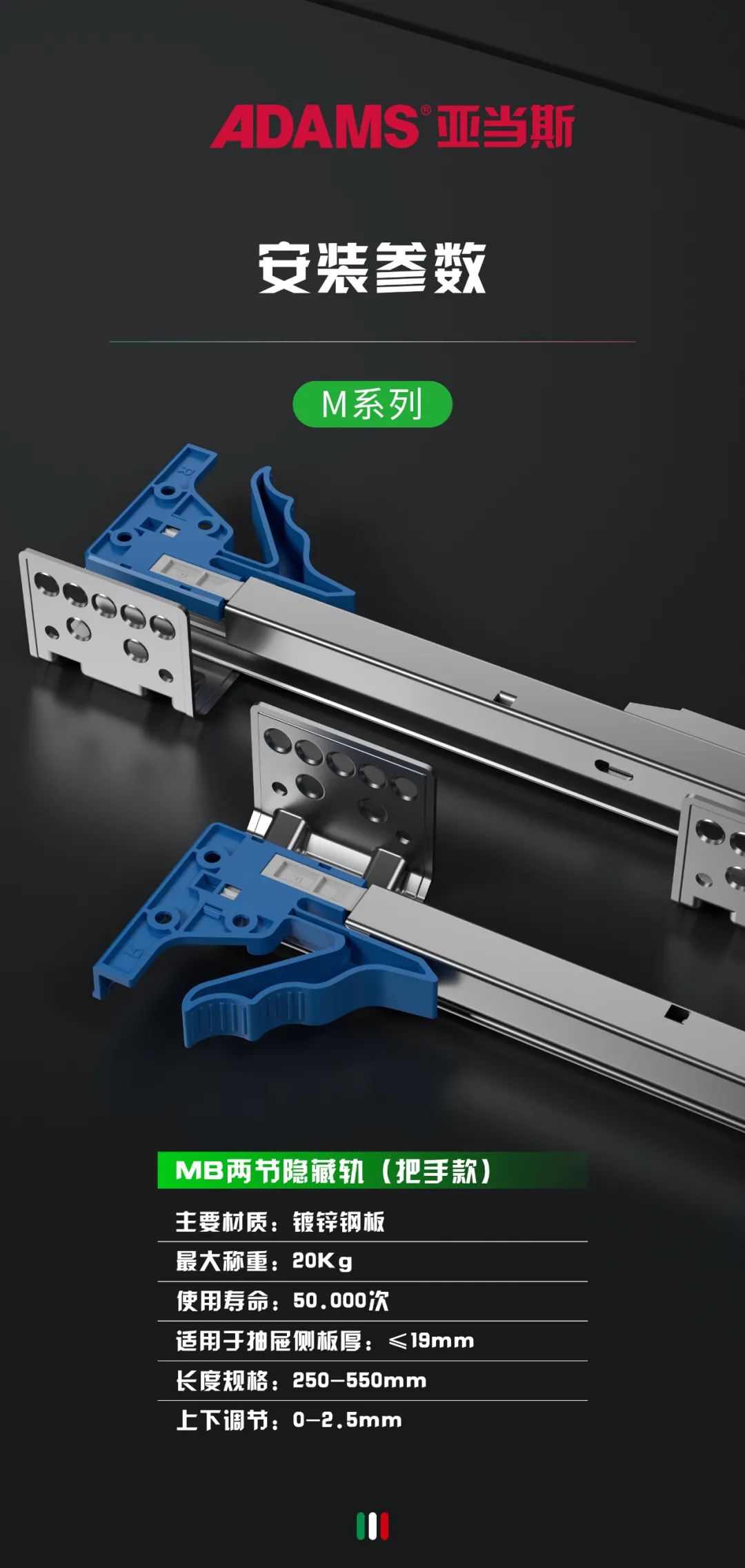 亞當(dāng)斯M系列二節(jié)隱藏滑軌分為:把手款和插銷款,根據(jù)家具安裝需求選擇最佳的抽屜搭檔即可,適配多種柜體,裝卸簡單省時提效。