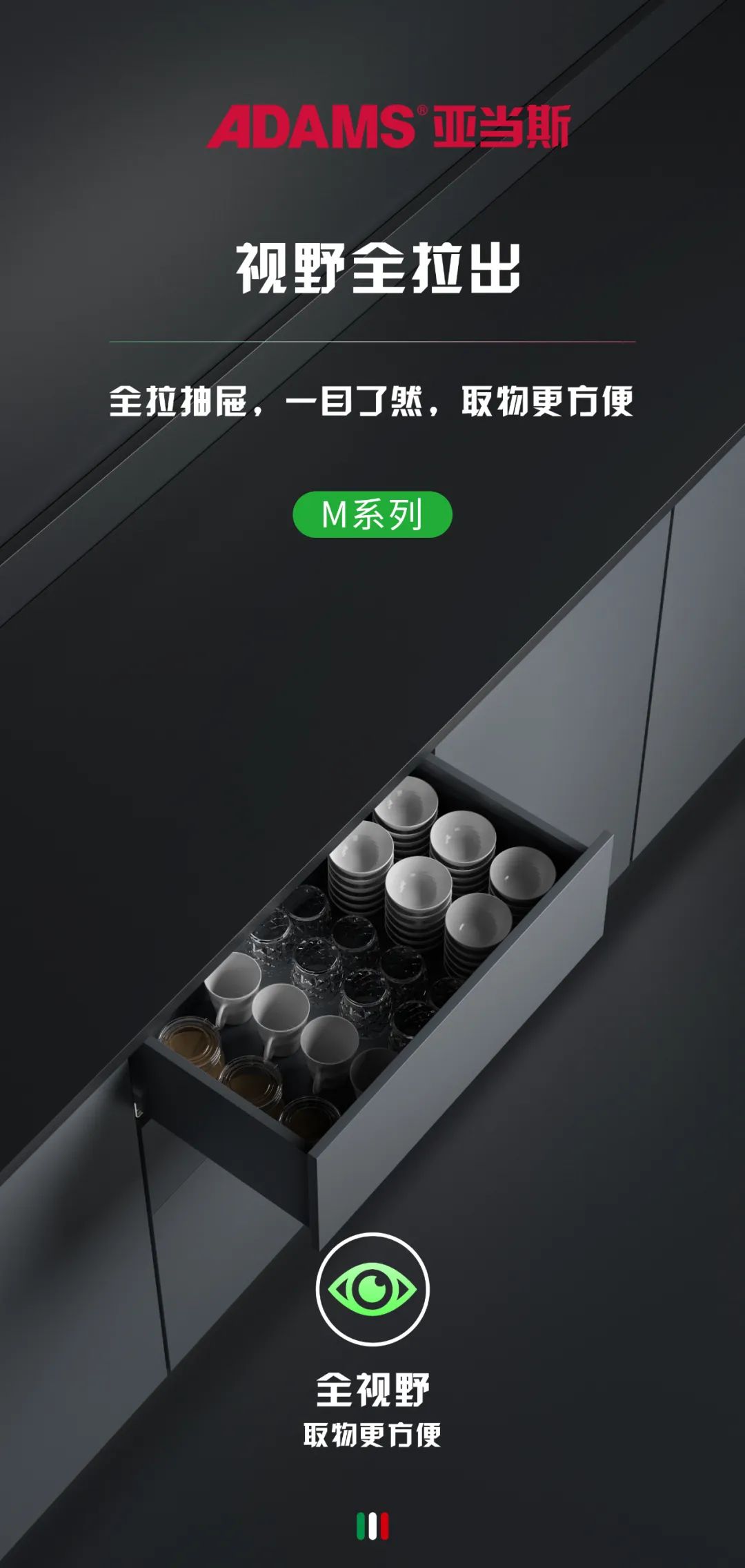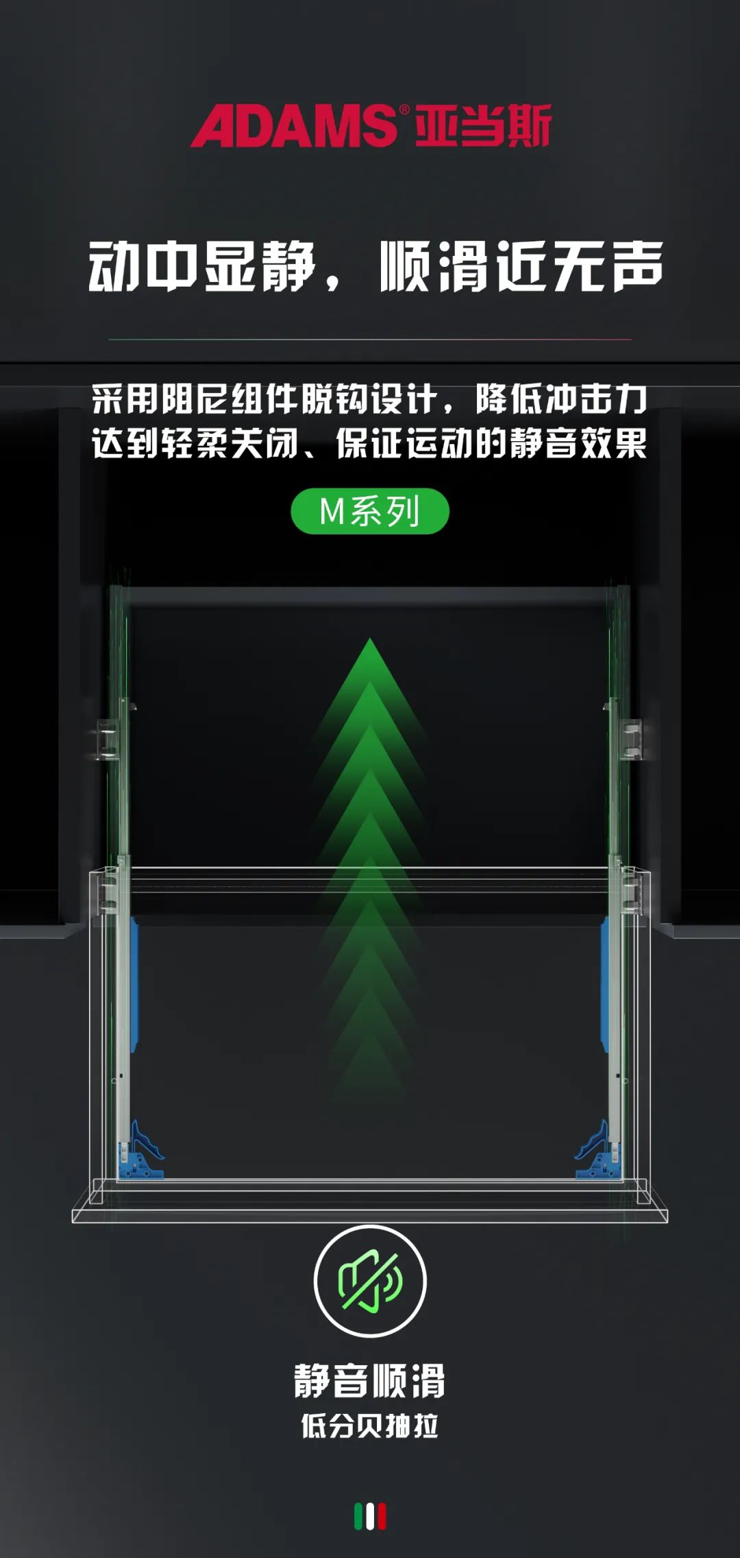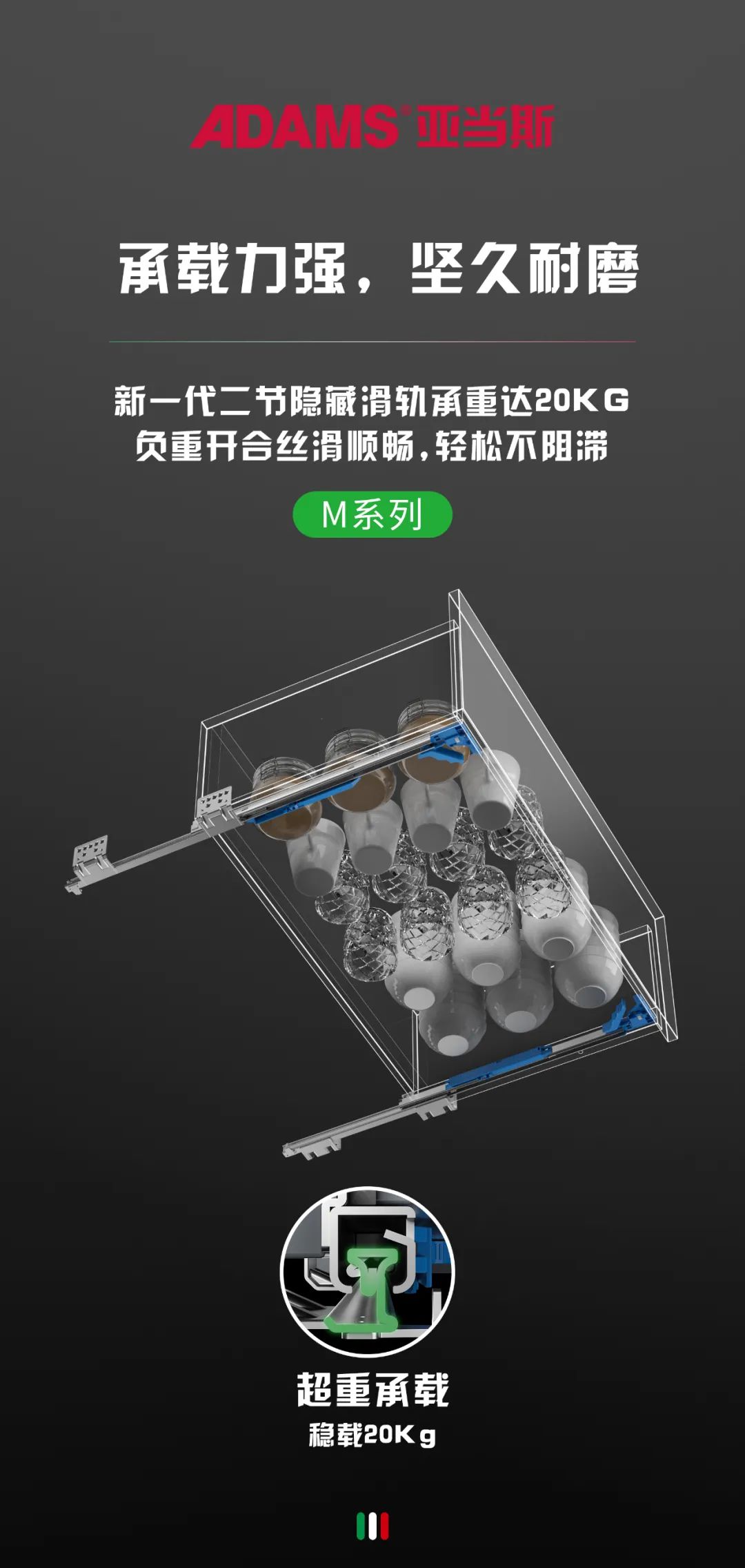 美好生活由此開啟,負(fù)重推拉不費力,亞當(dāng)斯M系列二節(jié)隱藏軌能承重達(dá)20kg,平穩(wěn)堅固。