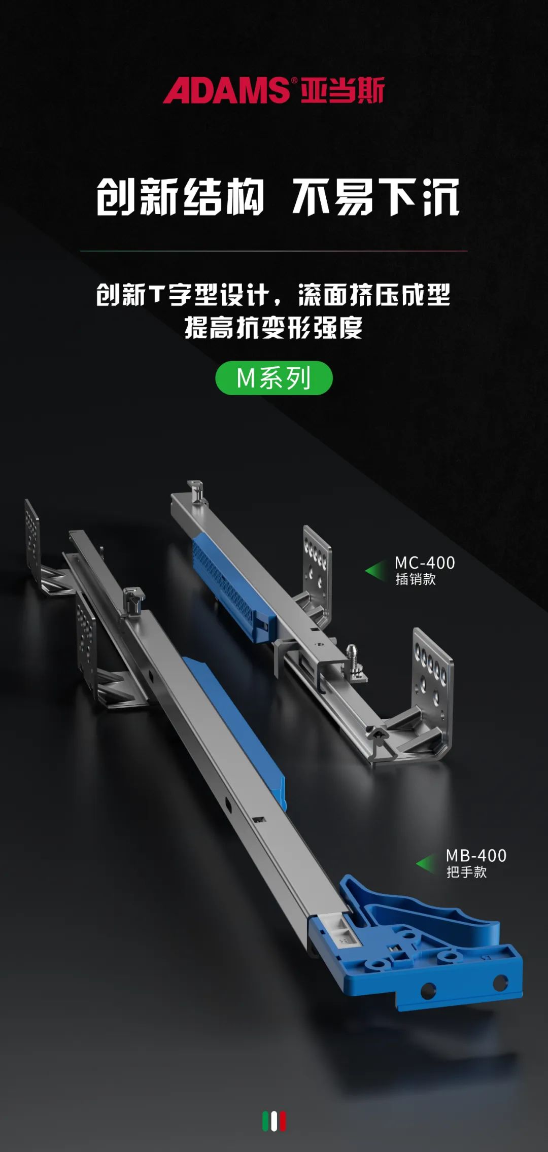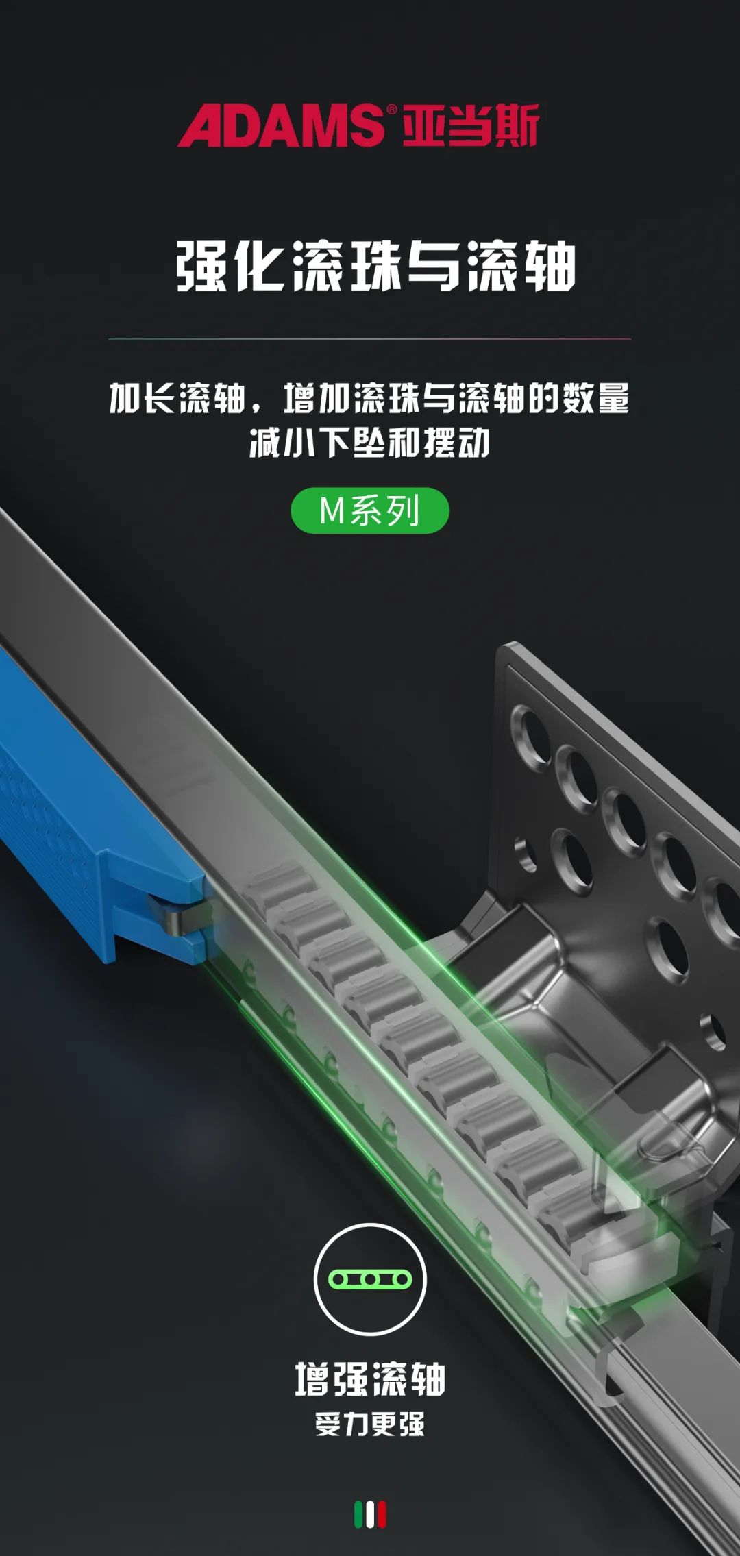 亞當(dāng)斯M系列二節(jié)隱藏滑軌采用創(chuàng)新T字型設(shè)計結(jié)構(gòu),滾面擠壓成型,軌道抗變形能力強(qiáng),即使在大重量下,滑軌運動絲滑順暢。