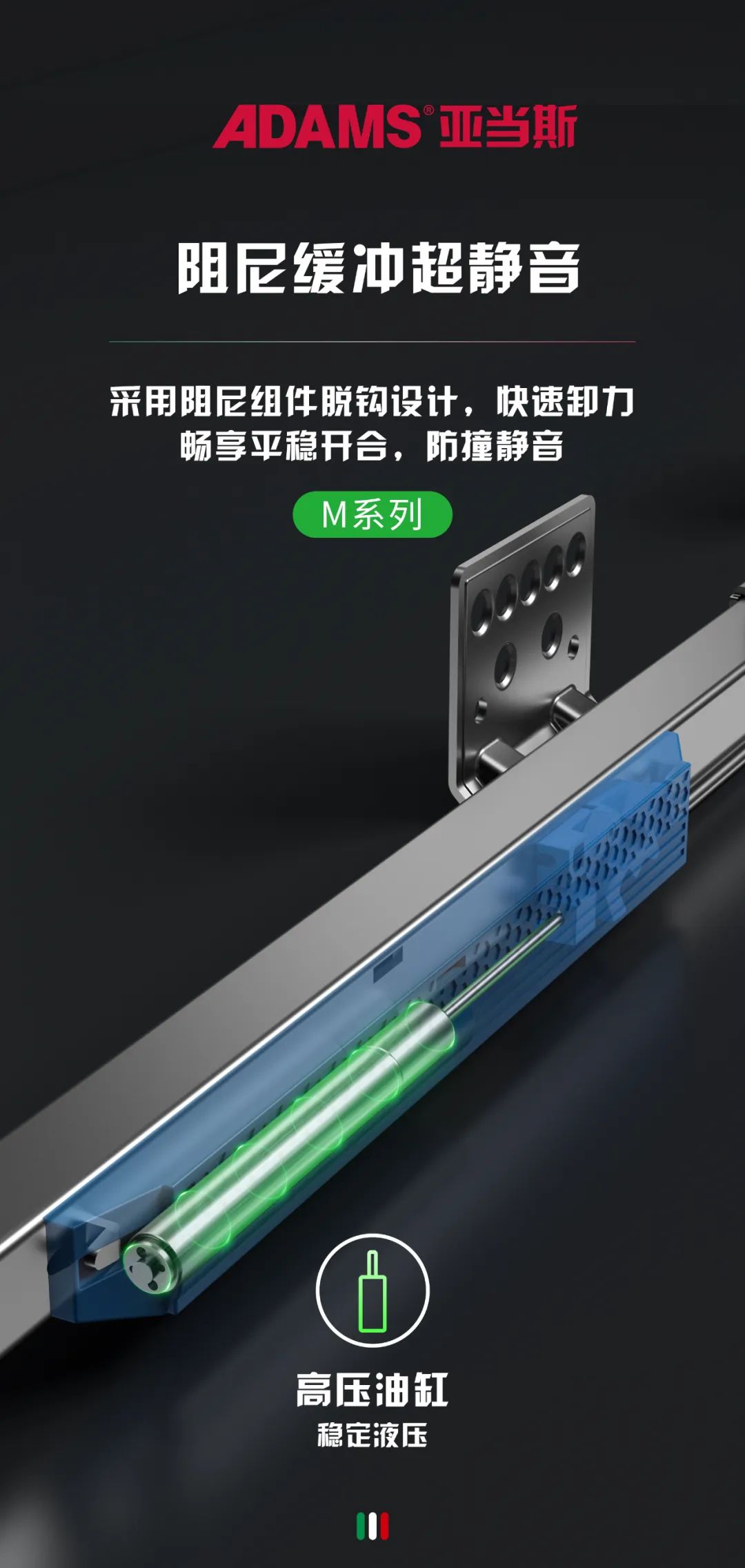 亞當(dāng)斯M系列二節(jié)隱藏滑軌采用高壓油缸、阻尼組件脫鉤設(shè)計,運動過程緩沖卸力,防撞耐用兼平穩(wěn)、無懼卡頓。