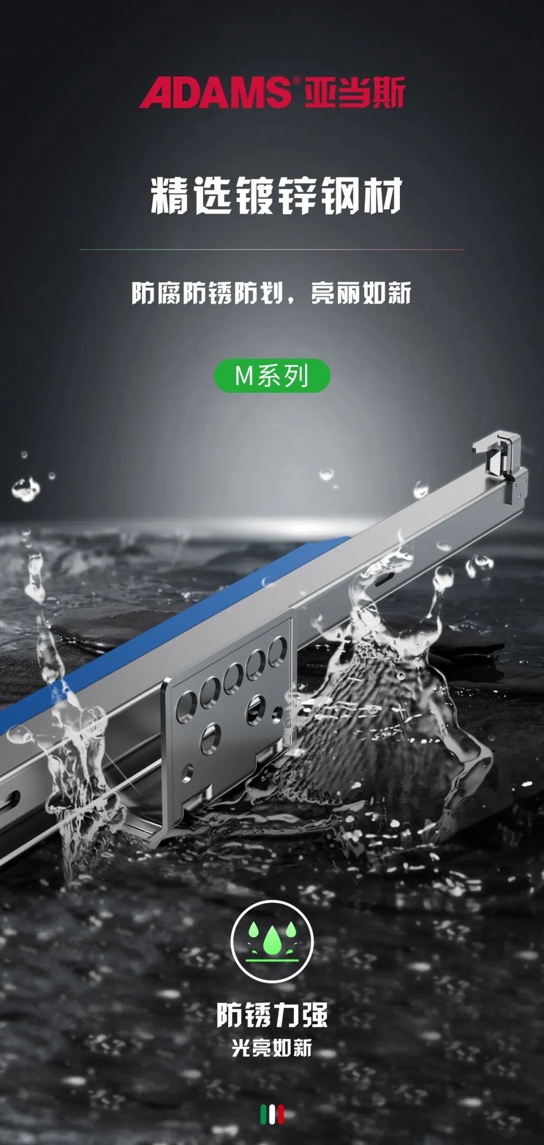 亞當(dāng)斯M系列二節(jié)隱藏滑軌采用精選鍍鋅鋼材,優(yōu)質(zhì)材料鑄就堅硬耐磨的性能,每一副滑軌都經(jīng)過嚴(yán)謹(jǐn)?shù)墓ば虼蛟於?。防腐防銹防劃,在復(fù)雜的家居環(huán)境也持久耐用。