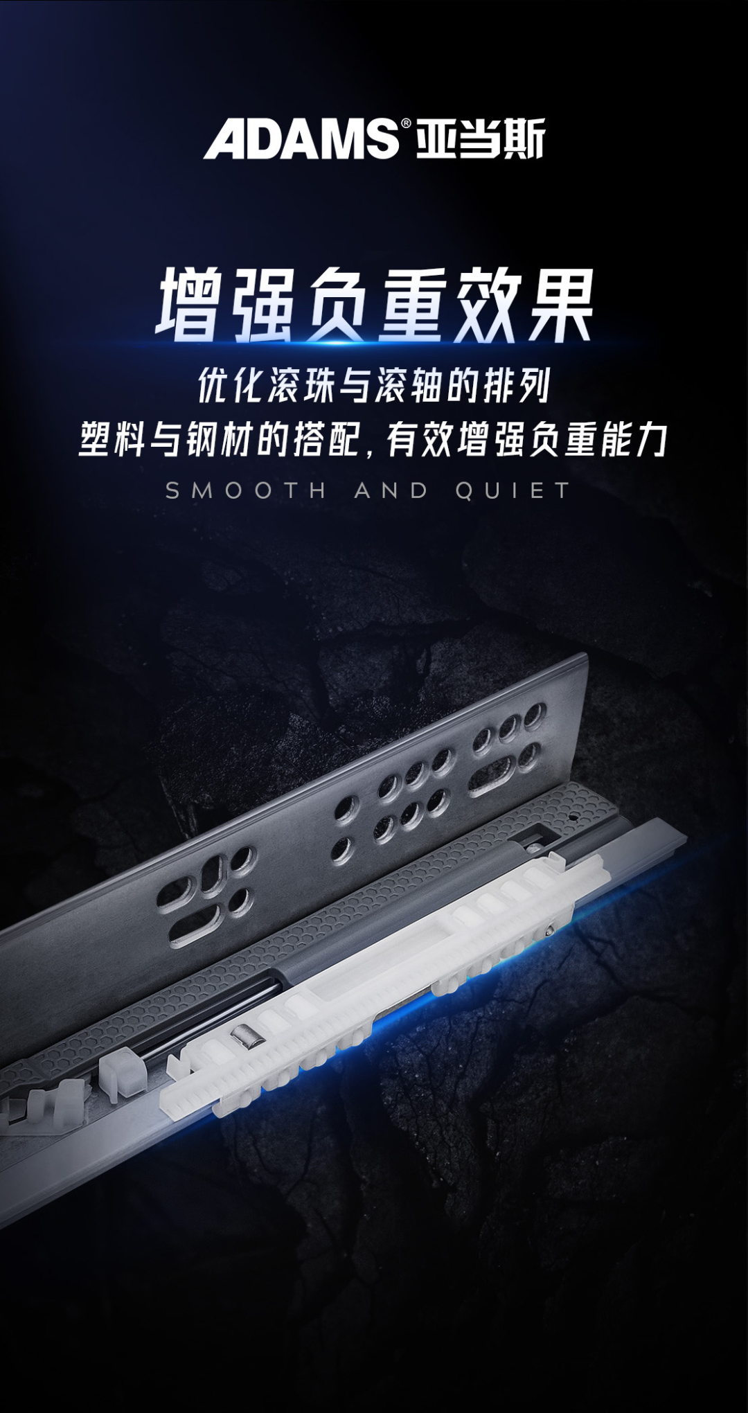 滑軌加長滾軸的長度,增加滾珠與滾軸的數(shù)量,塑料與鋼材的搭配,有效增強負重能力。